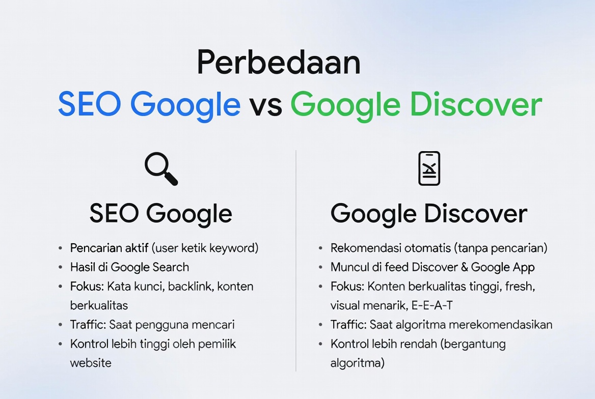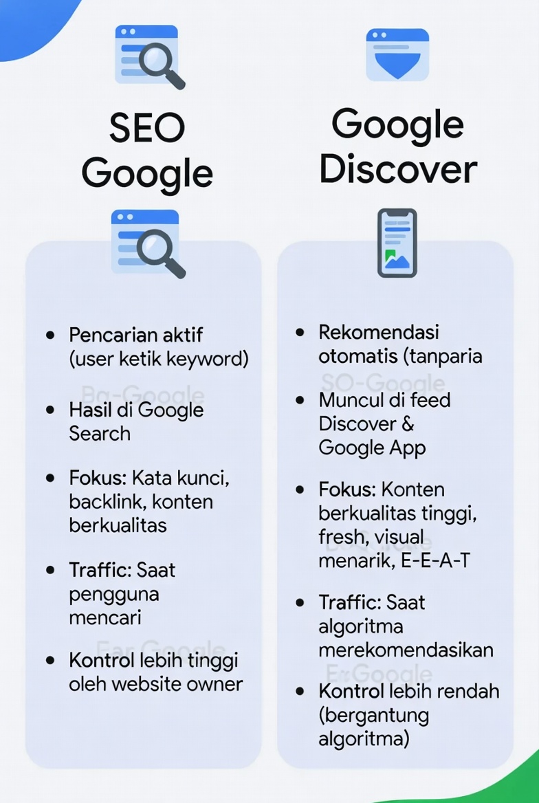 Dalam dunia digital marketing, banyak orang masih menganggap bahwa SEO Google dan Google Discover adalah hal yang sama. Padahal, keduanya memiliki cara kerja, strategi, dan trafik yang sangat berbeda. Memahami perbedaan ini sangat penting, terutama jika Anda ingin memaksimalkan trafik website secara cepat dan tertarget. Bahkan saat ini, banyak website yang justru mendapatkan trafik lebih besar dari Discover dibandingkan pencarian organik biasa.